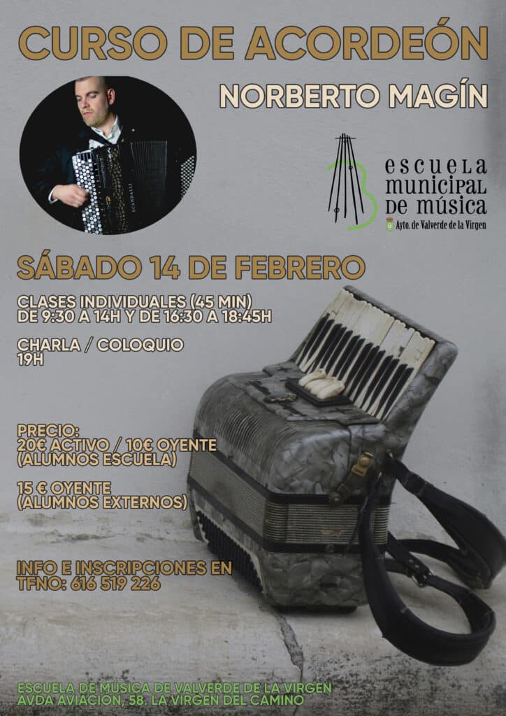 La Escuela Municipal de Música de Valverde de la Virgen celebrará el próximo sábado 14 de febrero un curso de acordeón impartido por el reconocido acordeonista Norberto Magín, dirigido tanto a alumnado del centro como a músicos externos interesados en el instrumento.